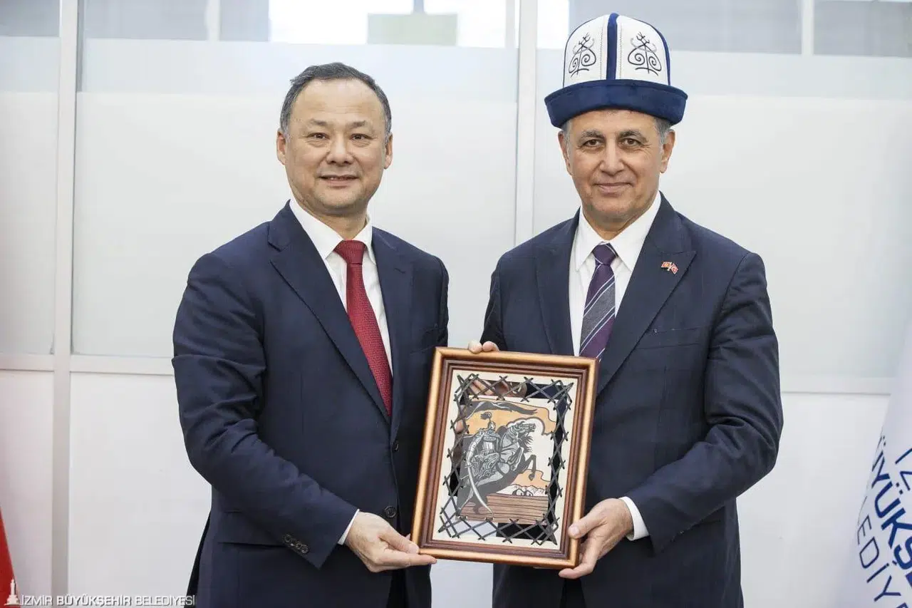 Kırgızistan’ın Ankara Büyükelçisi Ruslan Kazakbaev ile beraberindeki heyet, İzmir Büyükşehir Belediye Başkanı Dr. Cemil Tugay’ı açık ofisinde ziyaret etti. Kırgızistan’ın Bişkek kenti ile İzmir’in kardeş kent ilişkilerinin gelişmesi, Kırgızistan kentlerinin İzmir ile iş birliği yapmasının konuşulduğu buluşmada Kazakbaev, Başkan Tugay’ı Kırgızistan’a davet etti. Buluşma sonunda Kazakbaev, Tugay’a ak kalpak hediye etti.