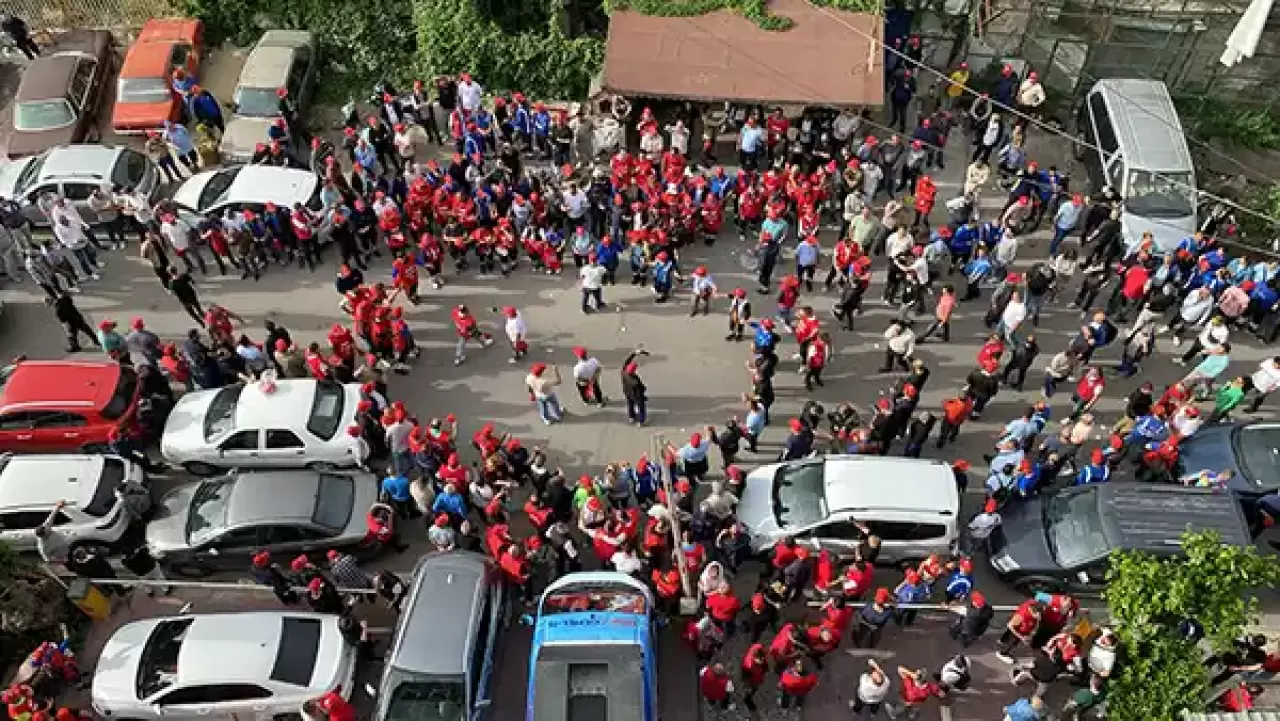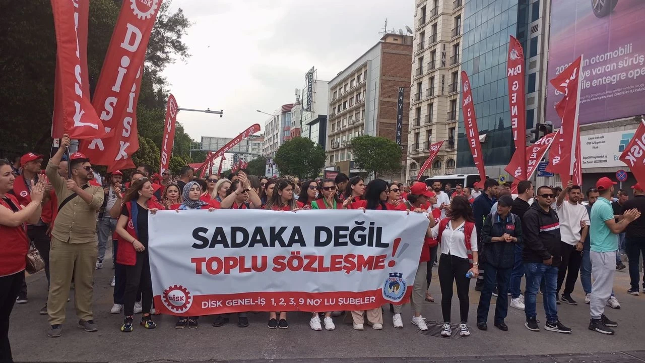 “Birleşe birleşe kazanacağız”, direne direne kazanacağız” diyerek sloganlarıyla DİSK Genel-İş Basmane binası önünden yürümeye başlayarak İzBB’nin Kültürpark’taki binasına gidip grev yazısı asacak.