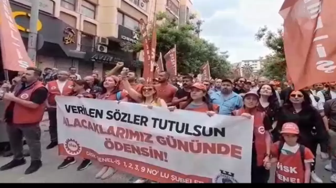 Devrimci İşçiler Sendikaları Konfederasyonu (DİSK) Genel-İş üyesi İzmir Büyükşehir Belediyesi bünyesindeki İZENERJİ, İZELMAN ve EGEŞEHİR Planlama A.Ş. çalışanlarından 23 bin emekçi bugün greve çıktı. Toplu İş Sözleşmesi’nin masada kalmasıyla hareketlenen işçiler, toplu sözleşme görüşmelerinin başladığı saatlerde İzBB binası önüne dayanarak “İş, ekmek, özgürlük”, “sözleşme hakkımız, grev silahımız” sloganları attı. İşçiler, bekleyişlerini sloganlar eşliğinde sürdürüyor. Yüzlerce işçi binanın önüne akın ediyor.
