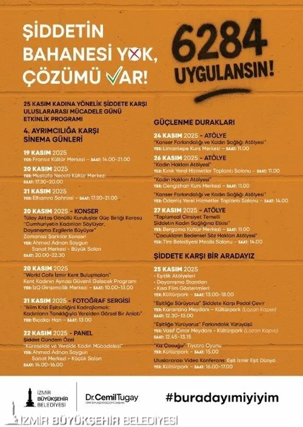 İzmir Büyükşehir Belediyesi, 25 Kasım Kadına Yönelik Şiddete Karşı Uluslararası Mücadele Günü kapsamında “Şiddete Karşı Bir Aradayız” ve “Birlikte Güçleniyoruz: Şiddetsiz Bir Kent İçin Kadın Dayanışması” temalarıyla kültür-sanat etkinliklerinden atölyelere, söyleşilerden kent buluşmalarına, farkındalık yürüyüşlerinden uluslararası video konferansa uzanan kapsamlı bir program sunuyor. Dünya genelinde ise bu yıl, her 10 dakikada bir kadının öldürüldüğüne dikkat çeken “Every 10 Minutes, a woman is killed. #NoExcuse” teması öne çıkıyor ve şiddetin önlenmesi için acil eylem çağrısı yapılıyor. İzmir Büyükşehir Belediyesi Kadın Çalışmaları Şube Müdürlüğü de toplumsal cinsiyet eşitliği perspektifini yerel yönetim çalışmalarının tüm aşamalarına entegre etme hedefi doğrultusunda, 25 Kasım haftasını “Buradayım, iyiyim” sloganı ile karşılıyor. Bu yılki program, İzmir Büyükşehir Belediyesi’nin yerel eşitlik politikaları, kadına yönelik şiddete karşı sıfır tolerans yaklaşımı, Kadın Dostu Kentler Programı ve Kadın Dostu Bütçeleme çalışmalarıyla doğrudan bağlantılı, kapsamlı bir farkındalık çerçevesi sunuyor.