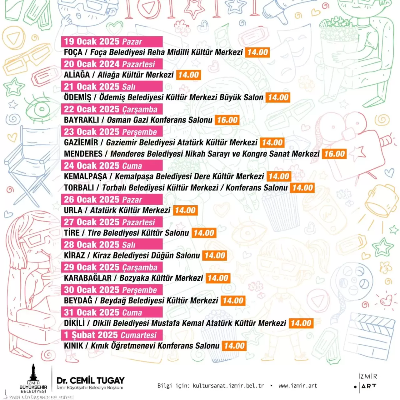 Tembeller Ailesi filmi 19 Ocak Pazar günü Foça Belediyesi Reha Midilli Kültür Merkezi’nde 14.00’te, 20 Ocak Pazartesi günü Aliağa Kültür Merkezi’nde 14.00’te, 21 Ocak Salı günü Ödemiş Belediyesi Kültür Merkezi Büyük Salon’da 14.00’te, 22 Ocak Çarşamba günü Bayraklı Osman Gazi Konferans Salonu’nda 16.00’da, 23 Ocak Perşembe günü Gaziemir Belediyesi Atatürk Kültür Merkezi’nde 14.00’te ve Menderes Belediyesi Nikah Sarayı ve Kongre Sanat Merkezi’nde 16.00’da, 24 Ocak Cuma günü Kemalpaşa Belediyesi Dere Kültür Merkezi’nde 14.00’te ve Torbalı Belediyesi Kültür Merkezi Konferans Salonu’nda 16.00’da, 26 Ocak Pazar günü Urla Atatürk Kültür Merkezi’nde 14.00’te, 27 Ocak Pazartesi günü Tire Belediyesi Kültür Salonu’nda 14.00’te, 28 Ocak Salı günü Kiraz Belediyesi Düğün Salonu’nda 14.00’te, 29 Ocak Çarşamba günü Karabağlar Bozyaka Kültür Merkezi’nde 14.00’te, 30 Ocak Perşembe günü Beydağ Belediyesi Kültür Merkezi’nde 14.00’te, 31 Ocak Cuma günü Dikili Belediyesi Mustafa Kemal Atatürk Kültür Merkezi’nde 14.00’te, 1 Şubat Cumartesi günü ise Kınık Öğretmenevi Konferans Salonu’nda yine 14.00’te gösterilecek.
