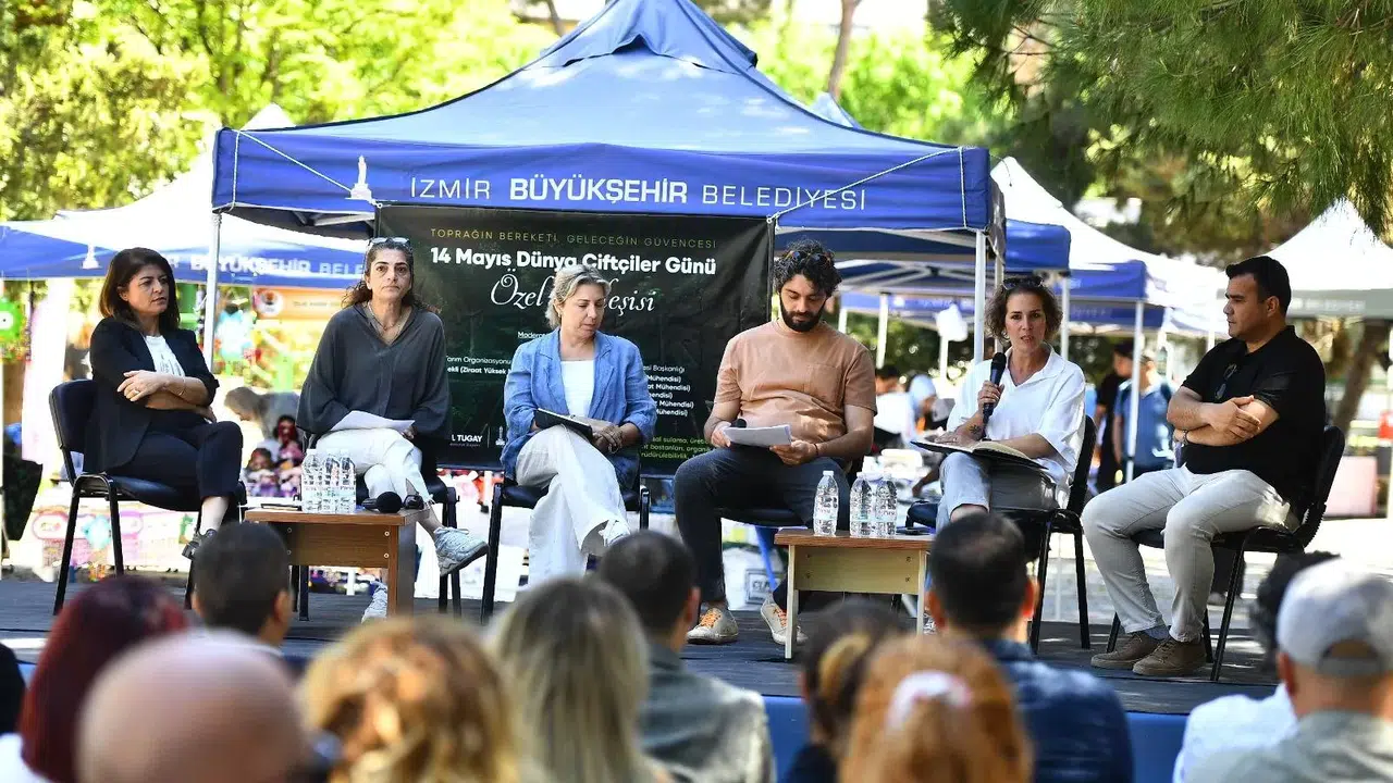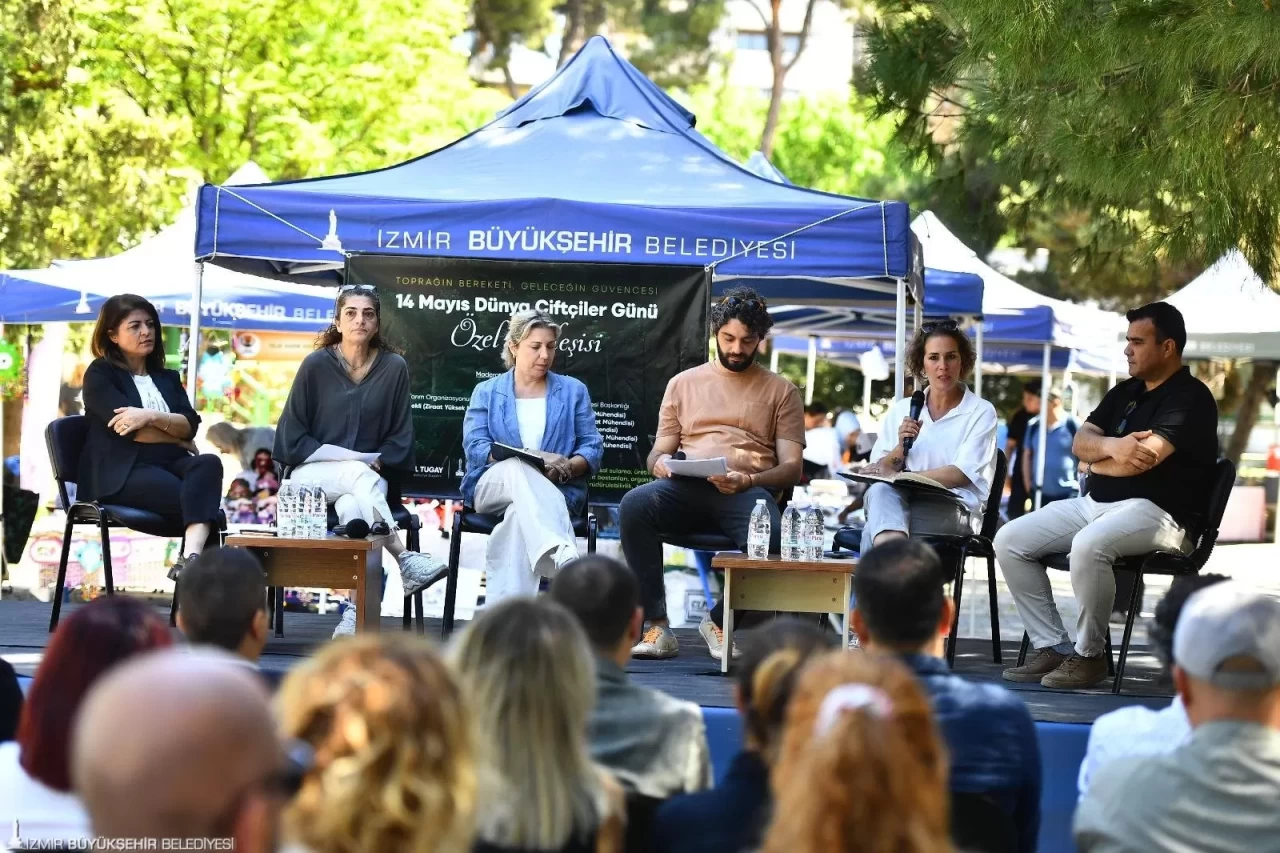 Konuşmaların ardından pazar alanında Dünya Çiftçiler Günü söyleşisi gerçekleştirildi. Söyleşide, Ekolojik Tarım Organizasyonu Derneği (ETO) Genel Sekreteri Ziraat Yüksek Mühendisi Özge Çiçekli ile İzmir Büyükşehir Belediyesi Tarımsal Hizmetler Dairesi Başkanlığı’nın ziraat mühendisleri Evrim Pınar Mak, Dr. Elvan Hatipoğlu, Erdinç Türkön, Dr. Mesut Yüce Yıldız, Nalan Uyğun Ergin konuşmacı oldu. Çiftçilerin sorularını yanıtlayan konuşmacılar, organik tarımdan iyi tarım uygulamalarına, sürdürülebilir tarımdan İzmir Büyükşehir Belediyesi’nin tarımsal projelerine, tarımsal sulamadan kent bostanlarına kadar pek çok konuyu masaya yatırdı.