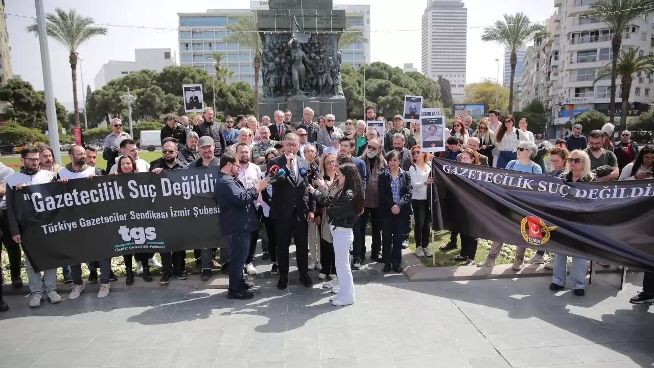 ‘Gazetecilik Suç Değildir’ pankartları, gözaltında olan gazetecilerin isimlerinin yazılı olduğu dövizlerle birlikte eyleme İzmir Büyükşehir Belediye Başkanı Dr. Cemil Tugay da destek verdi.