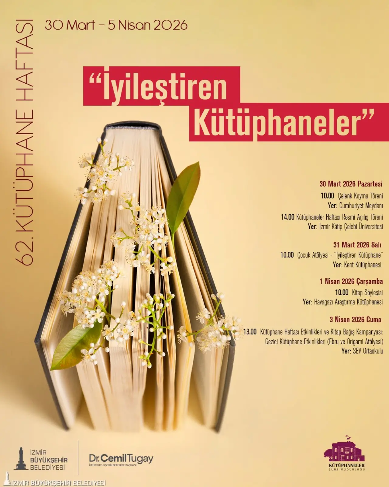 62. Kütüphane Haftası, İzmir Büyükşehir Belediyesi tarafından bu yıl “İyileştiren Kütüphane” temasıyla 30 Mart-5 Nisan tarihleri arasında kutlanıyor. Hafta kapsamında 1 Nisan Çarşamba 14.00-16.00 saatleri arasında “Dijital Kültürel Miras ve Açık Erişim: Kütüphanelerin ve Kent Arşivlerinin Rolü” başlıklı panel düzenlenecek.