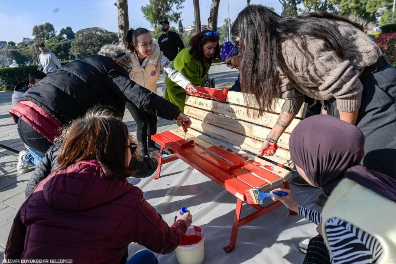 Konuşmaların ardından Başkan Tugay, eşi Öznur Tugay ve Daniele Bianchi bankı kırmızıya boyadı. Etkinlikte İzmirli kadınlar da farkındalık çalışmasına katılarak kadına yönelik şiddete karşı mesaj verdi. Başkan Tugay ve eşi Öznur Tugay, programın sonunda kadınlarla sohbet ederek hatıra fotoğrafı çektirdi. Alana yerleştirilen iki kırmızı bankın yanında ayrıca bir QR kod bulunuyor. Koda tıklandığında, “Kırmızı bank, cinayete kurban giden bir kadının toplumda bıraktığı boşluğun sembolüdür. Kadınlara yönelik şiddete hayır. İzmir İtalya Konsolosluğu ve İzmir Büyükşehir Belediyesi iş birliğiyle, 8 Mart Dünya Kadınlar Günü anısına kadınlar tarafından boyanmıştır” mesajı yer alıyor.