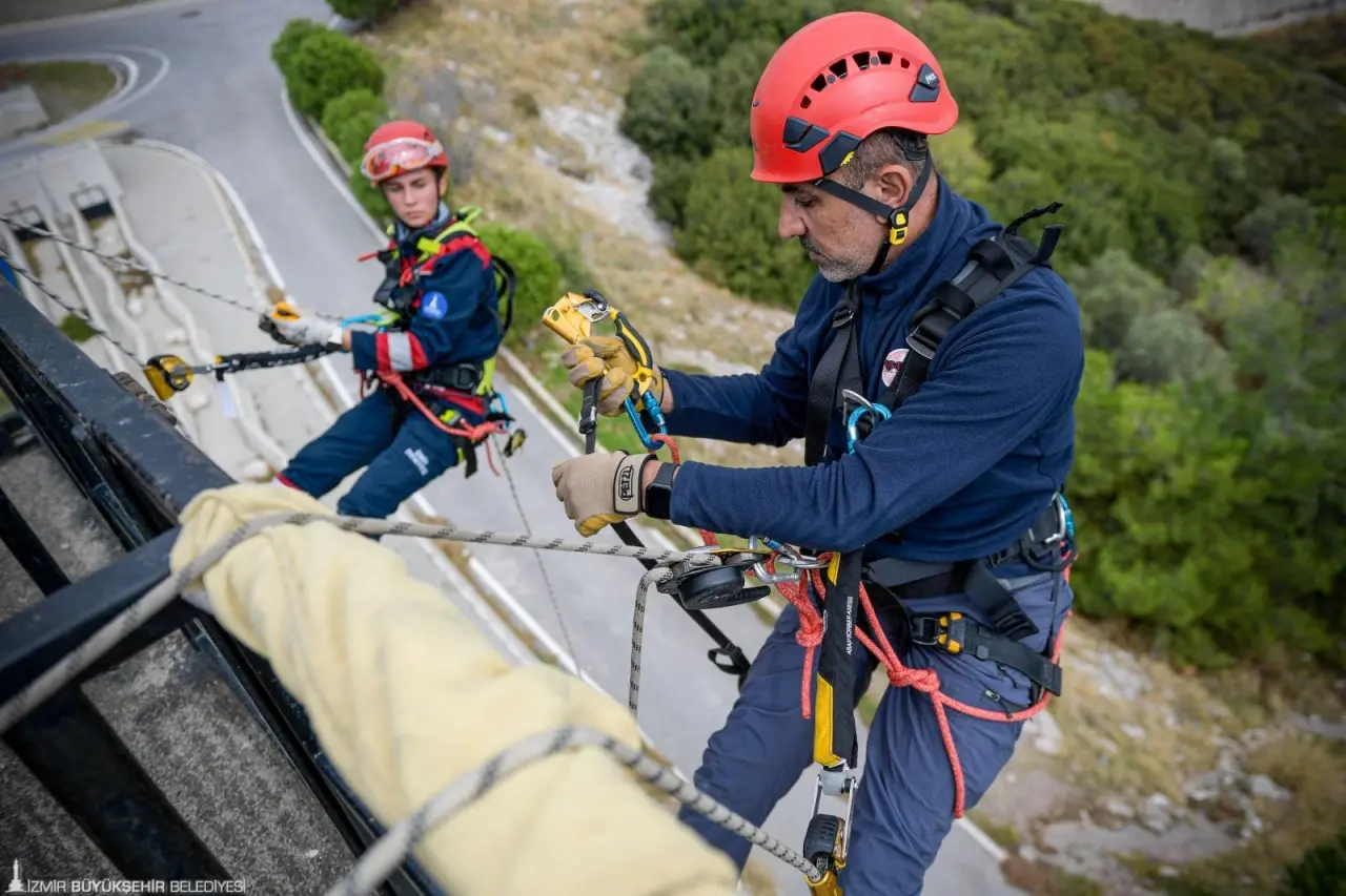 Eğitim Çavuşu Mesut Topal ise 15 metre yükseklikteki kuleden iple erişim tekniklerini anlattı. Topal, “Mesleğe yeni başlayan itfaiyeci arkadaşlarımıza basit istasyon kurulumu, yük dağılımı istasyon kurulumu, kullandığımız iplerin özellikleri hakkında eğitim veriyoruz. Teorik eğitimlerin ardından uygulamaya geçiyoruz. 15 metrelik kuleden aşağıya seri şekilde iniş ve tekrar yukarı tırmanma pratiği yapıyoruz. İpte asılı kalmış kişileri kurtarma, vadide, uçurumda, kuyularda kurtarılmayı bekleyen insanları, hayvanları kurtarma tekniklerini öğretiyoruz. Kentsel arama kurtarma, trafik kazalarında kurtarma ve iple erişim eğitimlerinin ardından arkadaşlarımız yeterli donanıma sahip oluyorlar. Biz de doğru ve eksiksiz bilgi vermek için elimizden geleni yapıyoruz. Bu sürecin sonunda umuyoruz ki arkadaşlarımız olaylara müdahale edecek yeterliliğe sahip olacak” diye konuştu.