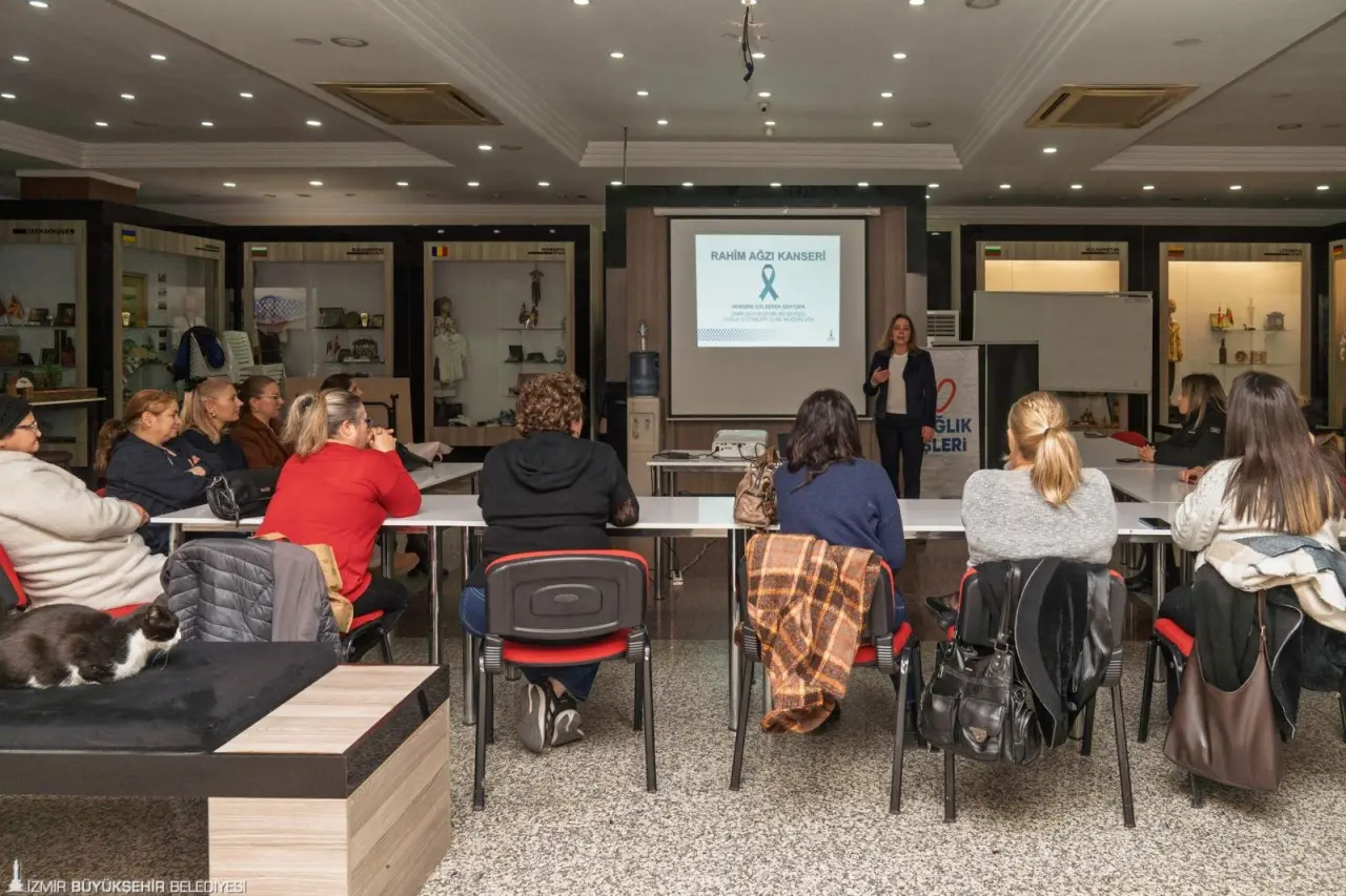 İzmir Büyükşehir Belediyesi, 30 ilçede Rahim Ağzı Kanseri Farkındalık Ayı kapsamında eğitimler düzenliyor. Eğitimlere katılan yurttaşlar, erken teşhis ve düzenli tarama ile önlenebilir bir hastalık olan rahim ağzı kanserine karşı bilinçleniyor.