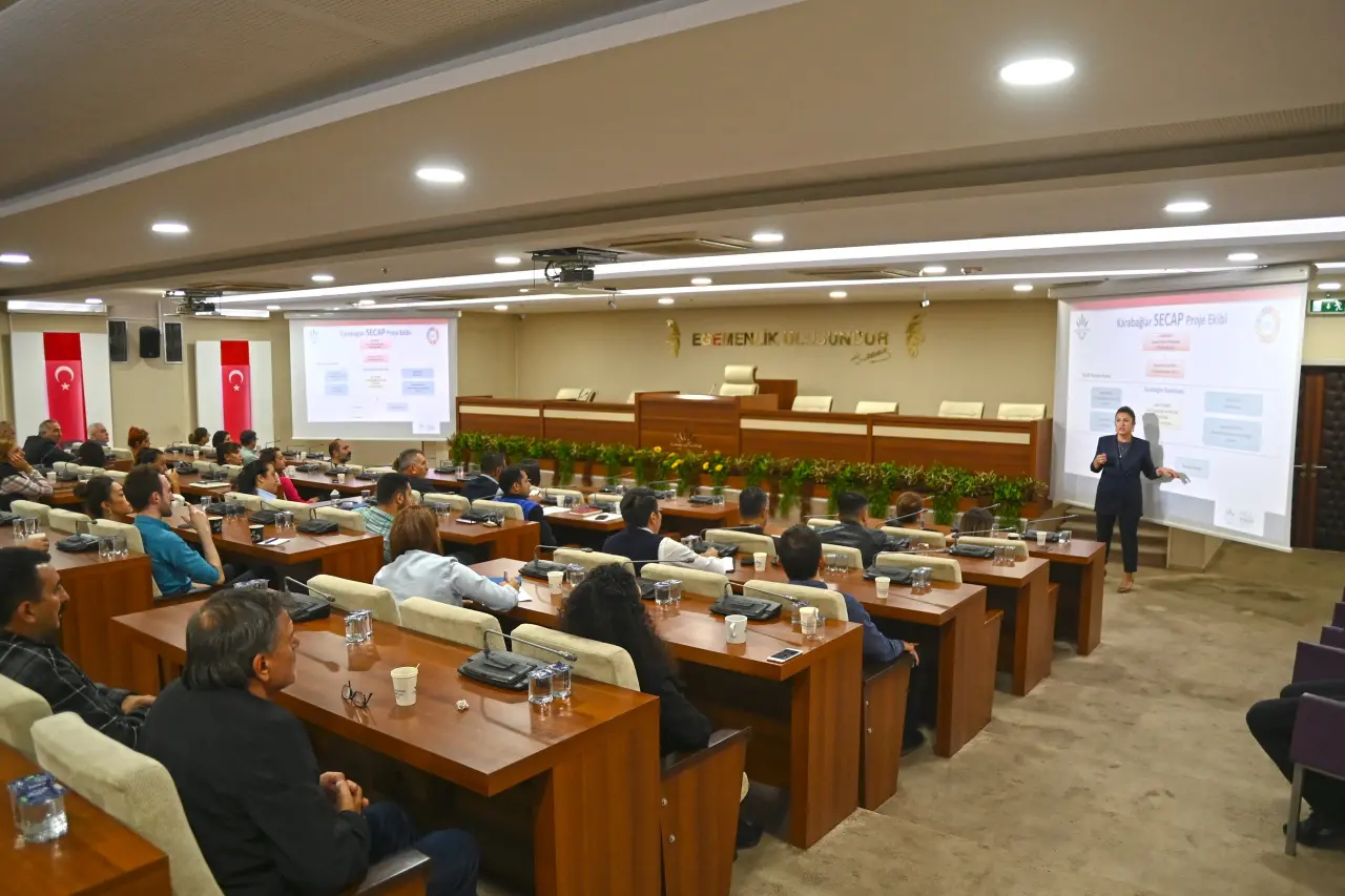 Bu kapsamda, Belediye Meclis Üyesi ve Çevre Mühendisi Rahile Yeni’nin sunumuyla Meclis Toplantı Salonu’nda bir iç paydaş toplantısı düzenlendi. Toplantıya Karabağlar Belediye Başkanı Helil Kınay, başkan yardımcıları, birim müdürleri ve SECAP veri sorumluları katıldı.
