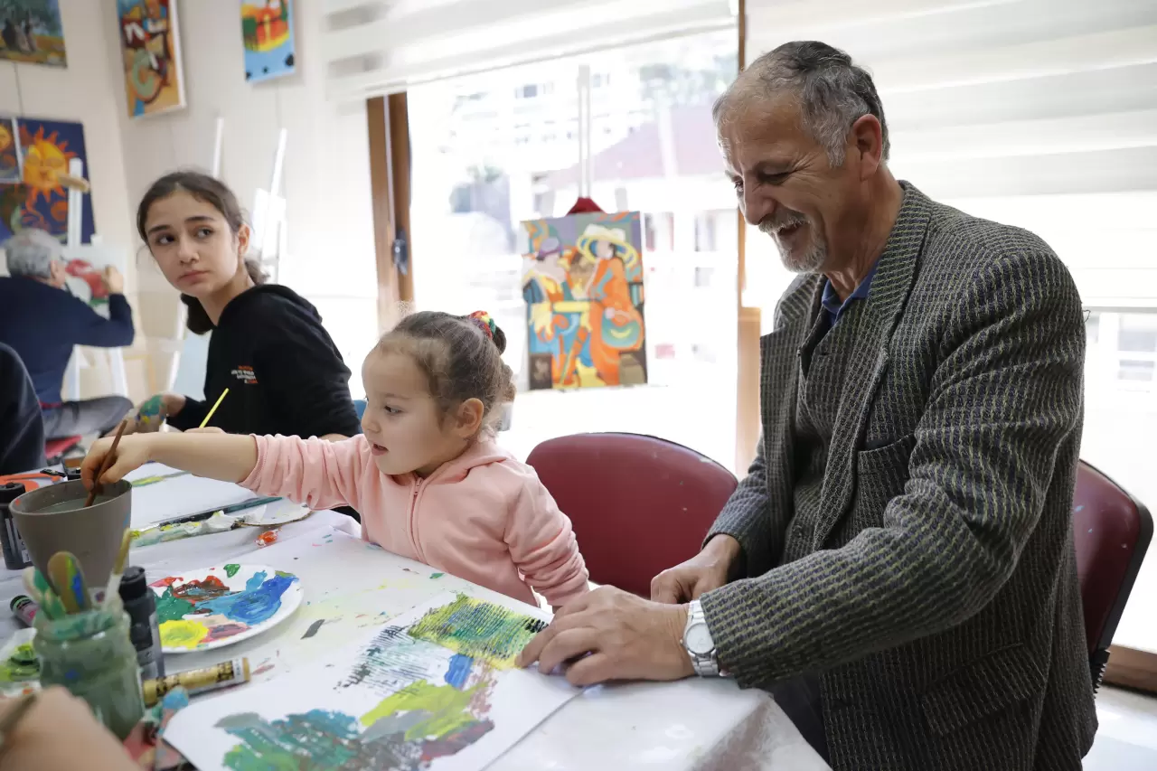 Konak Belediyesi, İleri Yaş Sağlıklı Yaşam Merkezi kursiyerleriyle torunları için sanat etkinliği düzenledi. Sosyal belediyecilik anlayışıyla hizmet veren belediye, 55 yaş üzeri vatandaşların sosyal yaşamda kalmasını sağlıyor.