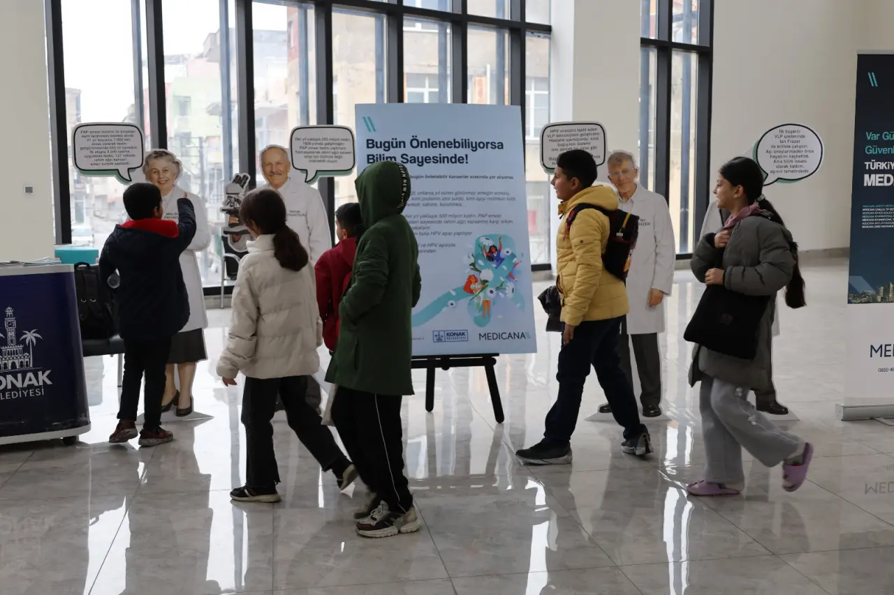 Rahim ağzı kanserine yönelik farkındalık oluşturmak ve bu hastalığa karşı mücadelenin yollarını anlatmak adına Konak Belediyesi Sağlık İşleri Müdürlüğü ve Medicana International İzmir Hastanesi iş birliğinde kapsamlı bir farkındalık çalışması gerçekleştirildi. ‘Bugün Önlenebiliyorsa Bilim Sayesinde’ başlığıyla rahim ağzı kanserine dikkat çekmek amacıyla Konak Belediyesi’nin Güzelyalı Nazım Hikmet Kültür Merkezi, Beştepeler Sosyal Tesisleri ve Toros Sosyal Tesisi’nde farkındalık alanları oluşturuldu. Sergide; rahim ağzı kanserinin erken teşhis edilerek önlem alınmasını sağlayan PAP smear testini geliştiren Mary Elizabeth H. Papanicolaou ve George Papanicolaou; araştırmalarıyla HPV-kanser ilişkisini ortaya çıkaran Nobel Ödüllü Harald zur Hausen; HPV aşısının geliştirilmesine katkı sunan Ian Frazer, Jian Zhou ve Alexander Meisels isimli bilim insanlarının temsili görselleriyle hastalığa karşı mesaj verildi. Rahim ağzı kanserine karşı oluşturulan farkındalık sergisine merkezlerdeki hizmetlerden faydalanan kadınlar büyük ilgi gösterdi.