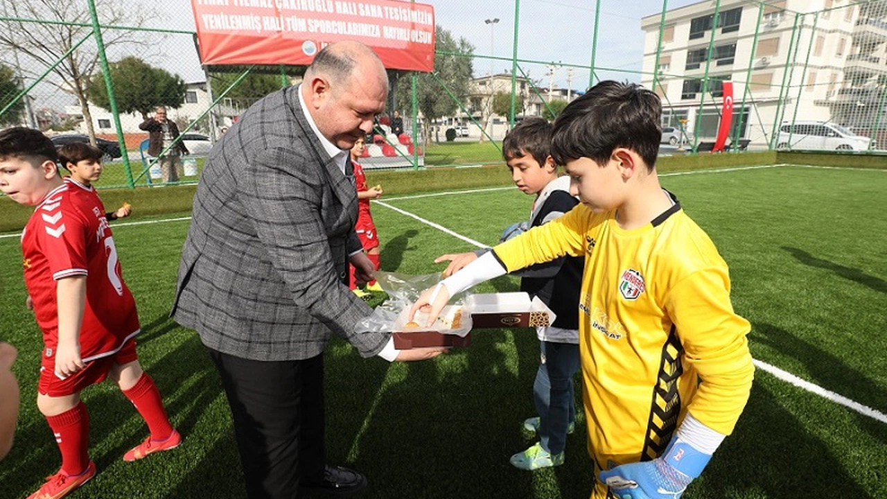 Menderes Belediye Başkanı Çiçek, Fırat Yılmaz Çakıroğlu Spor Tesisleri'ndeki yenilenen halı sahaları açtı, çocuklarla futbol oynayarak baklava ikram etti.