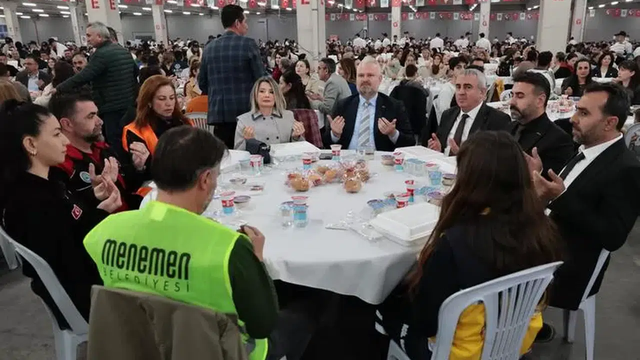 Menemen Belediyesi'nde zam sevinci yaşandı. Menemen Belediye Başkanı Aydın Pehlivan, Halil Alkaya Pazar Yeri'nde tüm birimlerden oluşan belediye personeli ve aileleriyle iftar sofrasında buluştu. Ramazan'ın yalnızca oruç tutmak değil, gönülleri yakınlaştırma ve dayanışmayı güçlendirme anlamını taşıdığını belirten Pehlivan, "bugün burada, sadece bir iftar sofrasının etrafında değil, Menemen’imizin yarınlarını daha güçlü ve daha güzel kılma iradesinde bir araya geldik! Bu birlikteliğimiz, kardeşlik hukukumuz gibi ebedi olsun, aramızdaki dayanışma büyüsün, bereketlensin inşallah." ifadelerini kullandı.