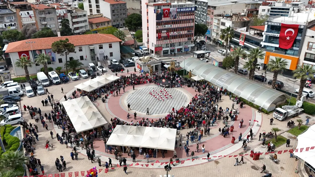 Menemen'de 23 Nisan Ulusal Egemenlik ve Çocuk Bayramı kutlamalarının merkeziyse, Menemen Cumhuriyet Meydanı oldu. Menemen Belediye Başkanı Aydın Pehlivan, Menemen Kaymakamı Vedat Yılmaz, Menemen Garnizon Komutanı Topçu Albay Zekeriya Tosun, Menemen Cumhuriyet Başsavcısı Hüseyin Kaçar, kamu kurum ve kuruluşlarının temsilcileri, siyasi parti ve STK temsilcileri, gaziler, çocuklar ve vatandaşlar katıldı. Saygı duruşu ve İstiklal Marşı'nın ardından Menemen İlçe Milli Eğitim Müdürü Sibel Ağaoğlu Özer, günün önemini belirten konuşmasını yaptı. Özer'in konuşmasının ardından program, şiirler ve yurdumuzun dört bir köşesine ait halk oyunlarının oynanmasıyla tamamlandı. Minik öğrencilerin program boyunca başarılı performansları, izleyenlerden büyük alkış aldı.