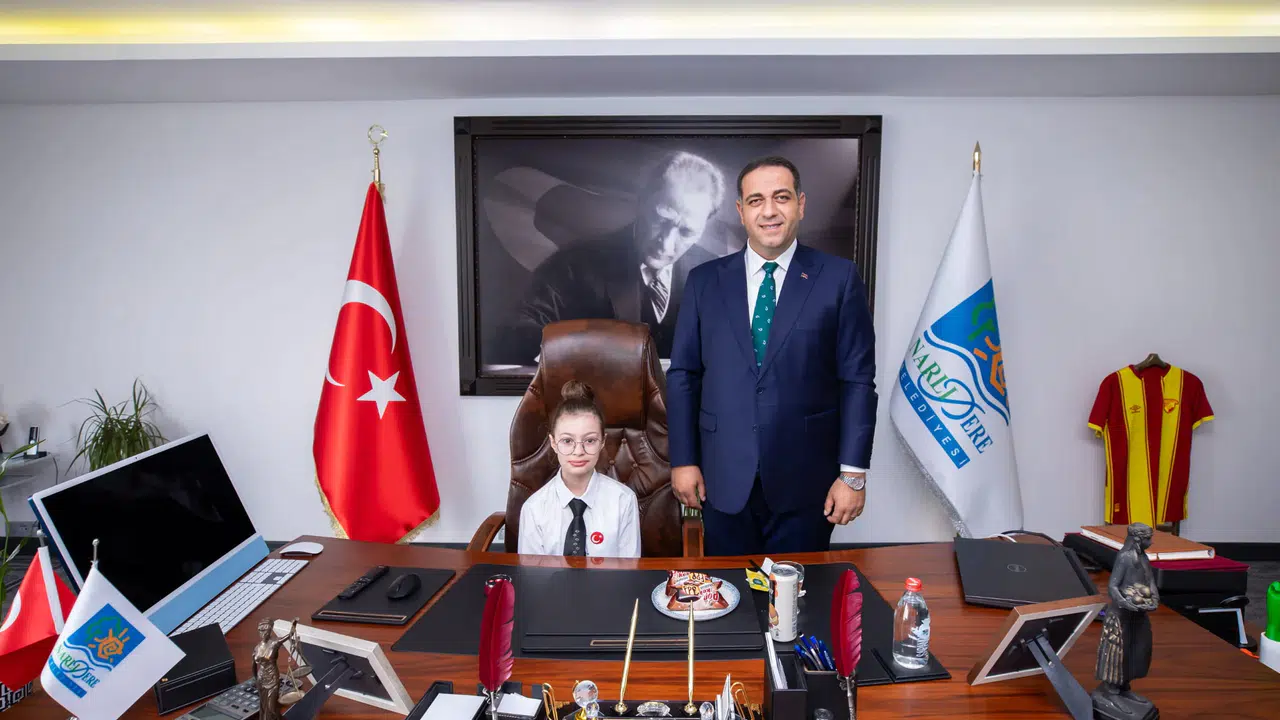 Demokrasi Meydanı’nda gerçekleştirilen kutlama programı öncesinde, Narlıdere Belediyesi Başkanlık makamında devir teslim töreni de vardı. Narlıdere Belediye Başkanı Erman Uzun, 23 Nisan’da başkanlık koltuğunu İlhan Onat İlkokulu 4'üncü sınıf öğrencisi Asya Ak’a devretti. Minik Asya, çocukların sadece geleceğin değil, bugünün de söz sahipleri olduğunu ifade ederek, “Tablet ve telefon bağımlısı çocuklar değil, spor yaparak, eğlenerek ve eğlenirken öğrenen çocuklar olmak istiyoruz. Bizler ne kadar öğrenirsek geleceğimiz o kadar güzel olur. Bu bayramı bizlere armağan eden Atatürk’e teşekkür ediyorum” dedi.