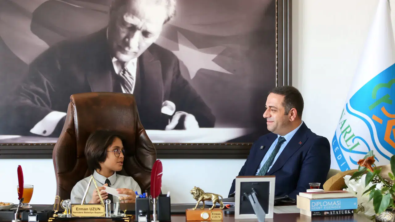 Boran’ın talimatlarını tek tek not aldıklarını söyleyen Başkan Erman Uzun, Boran’a teşekkür ederek “Müdürlerimiz burada, talimatlarınızı aldı. Çevreye ve doğaya duyarlı, sosyal, akranlarını, arkadaşlarını, Narlıdere’yi düşünen talimatların için sana çok teşekkür ediyorum. Öğretmenlerine, ailene de senin gibi bir evlat yetiştirdikleri için kutluyorum. İnanıyorum ki sende büyüdüğünde bu sağduyunla, geleceğe bakışınla Narlıdere’mize ve memleketimize hizmet edeceksin. Ailen de öğretmenlerin de seninle gurur duyacak. Bu yıl hem 23 Nisan Ulusal Egemenlik ve Çocuk Bayramımızı hem de TBMM’nin açılışının 105’inci yıl dönümünü kutluyoruz. Kurduğu Cumhuriyeti gelecek nesillere emanet eden Ulu Önderimiz Atatürk, ilk milli bayramımızı çocuklara adadı. Bizler, bu emanete sahip çıkacak, çocuklarımız için daha adil, eşit ve yaşanabilir bir gelecek kurmak için çok çalışmaya devam edeceğiz. Bugün koltuğu devrettiğimiz Boran’nın hayalleri, bu noktada bize yol gösterici olacak. 23 Nisan Ulusal Egemenlik ve Çocuk Bayramımız Kutlu Olsun” diye konuştu.
