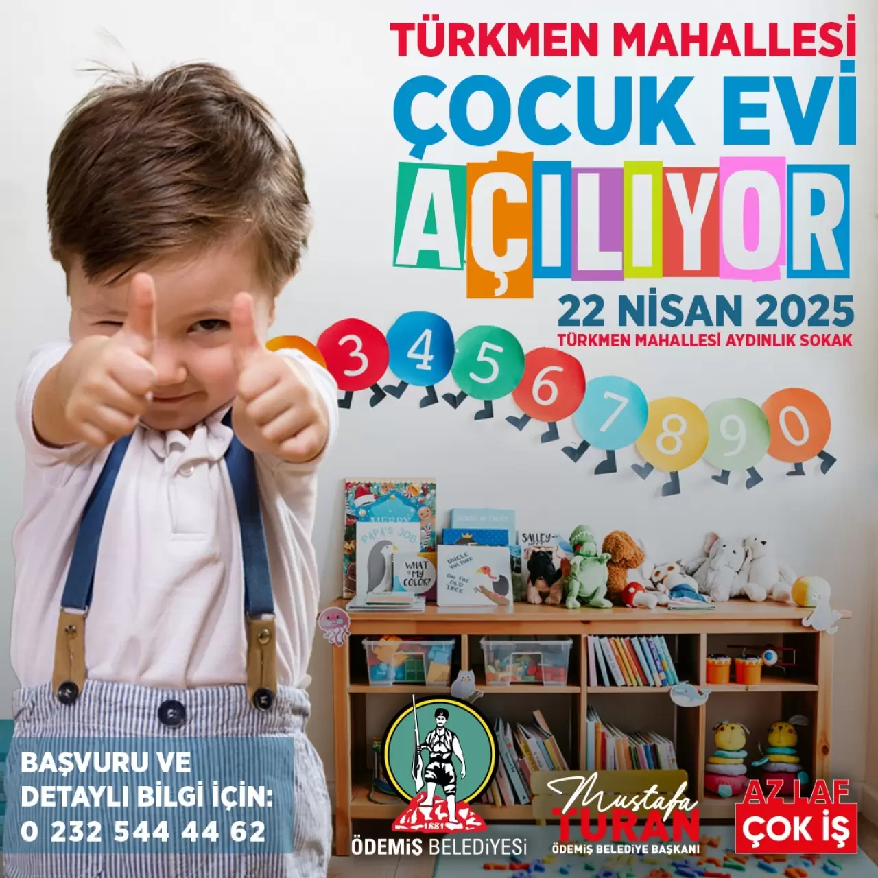 Ödemiş Belediyesi, çalışan annelere destek olmak, çocukların güvenli ve eğitici bir ortamda vakit geçirmesini sağlamak amacıyla Türkmen Mahallesi’nde Çocuk Evi Projesi’ni uygulamaya başlıyor. Türkmen Mahallesi Aydınlık Sokak’ta düzenlenen Çocuk Evi, 22 Nisan Salı günü hizmete sunulacak. Ulu Önder Mustafa Kemal Atatürk’ün çocuklarımıza armağanı olan 23 Nisan’ın en güzel şekilde kutlanacağını ifade eden Başkan Turan;