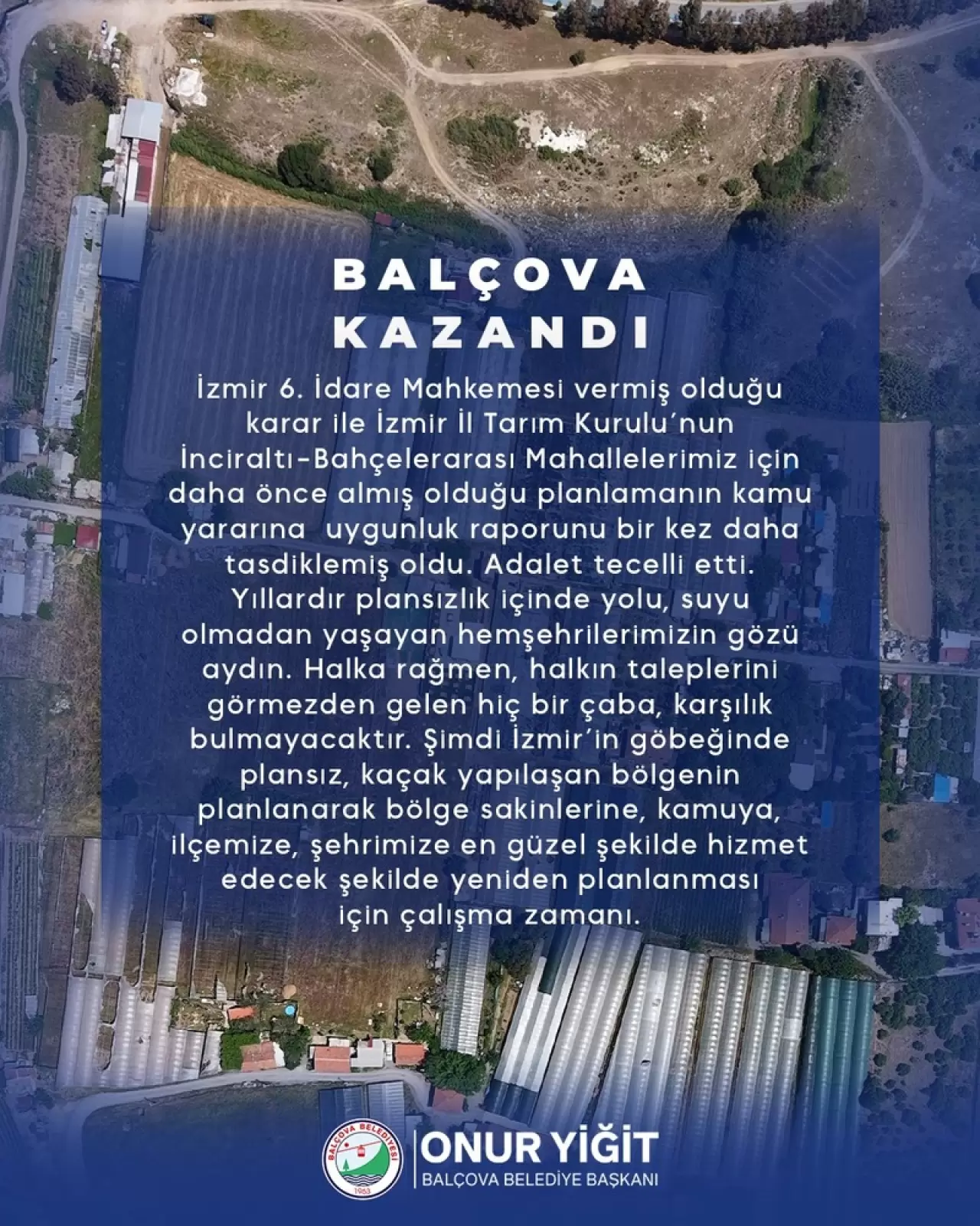 “İzmir 6. İdare Mahkemesi, vermiş olduğu karar ile İzmir İl Tarım Kurulu’nun İnciraltı-Bahçelerarası mahallelerimiz için daha önce almış olduğu planlamanın kamu yararına uygunluk raporunu, bir kez daha tasdiklemiş oldu. Adalet tecelli etti. Yıllardır plansızlık içinde yolu, suyu olmadan yaşayan hemşehrilerimizin gözü aydın. Halka rağmen, halkın taleplerini görmezden gelen hiç bir çaba, karşılık bulmayacaktır. Şimdi İzmir’in göbeğinde plansız, kaçak yapılaşan bölgenin planlanarak bölge sakinlerine, kamuya, ilçemize, şehrimize en güzel şekilde hizmet edecek şekilde yeniden planlanması için çalışma zamanı.”