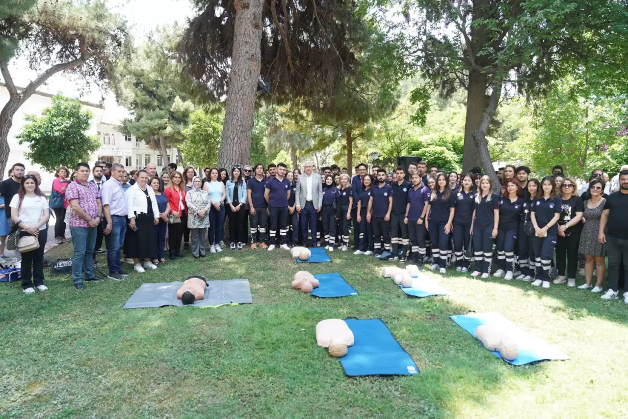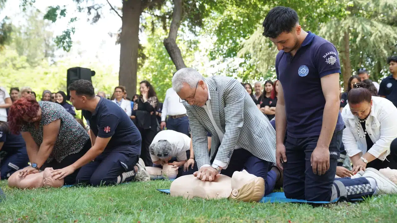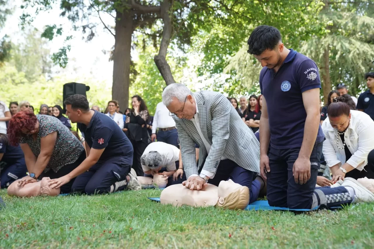 Rektörlük bahçesinde gerçekleştirilen etkinlikler kapsamında Rektör Prof. Dr. Necdet Budak, öğrencilerle birlikte cansız manken üzerinde kalp masajı ve suni solunum uygulaması gerçekleştirdi.