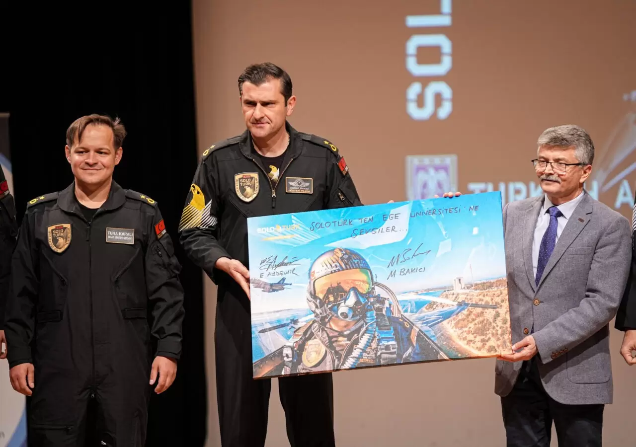 SOLOTÜRK'ten Hava Pilot binbaşılar Murat Bakıcı ve Mustafa Erhan Aydemir ile Hava Uçak Bakım Binbaşı Tuna Karalı, Ege Üniversitesi (EÜ) Prof. Dr. Yusuf Vardar MÖTBE Kültür Merkezi'nde söyleşi gerçekleştirdi.