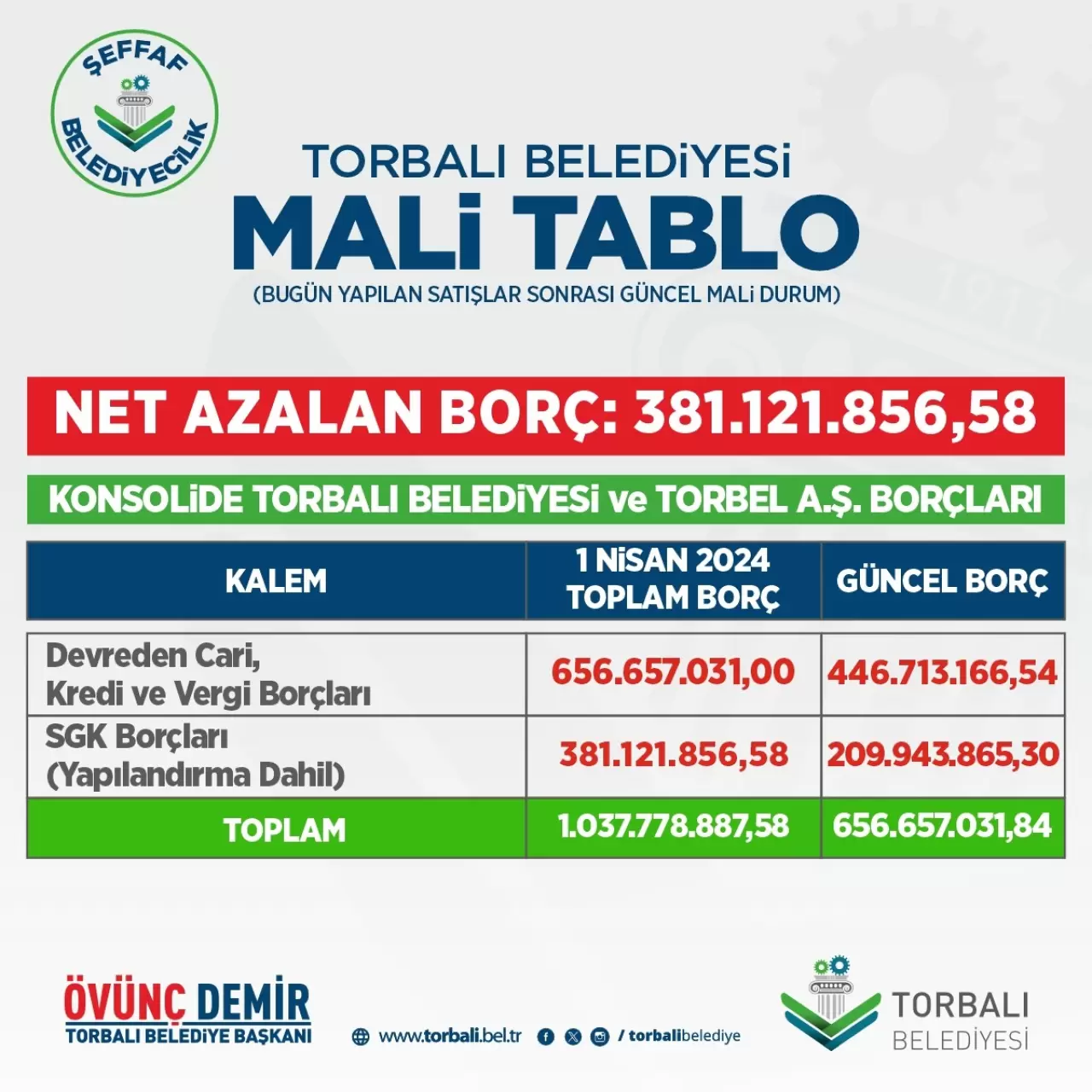 Diğer yandan ilçenin gelmiş geçmiş en şeffaf yönetim örneklerine imza atan Torbalı Belediyesi, ikinci etap kapsamında yüksek faizli borçları düşük faizli krediye çevirerek enflasyona karşı borç yükünü hafifletmeyi ve yatırım maliyetlerini düşürmeyi planlıyor. Üçüncü etapta ise toplu konut projeleri, meydan projesinin tamamlanması, yeni dükkanların belediye envanterine eklenmesi, katlı pazar yeri gibi gelir getirici projeler ve yarım kalan belediye binasının tamamlanması hedefleniyor. Torbalı Belediye Başkanı Övünç Demir, yürütülen bu finansal modelle belediyenin esnaf, sanayici, çiftçi ve işçiyi güçlendiren bir yapıya kavuşacağını vurgulayarak, “Doğru yoldayız. Kamucu finans ve bilimsel varlık yönetimiyle şehrimize değer katacağız” dedi. Öte yandan belediyenin güncel mali durumunu da paylaşan Torbalı Belediyesi, son satışlarla birlikte belediyenin 1 Nisan 2024 itibariyle 381 milyon 121 bin 856 liralık bir borcun azaldığını duyurdu.