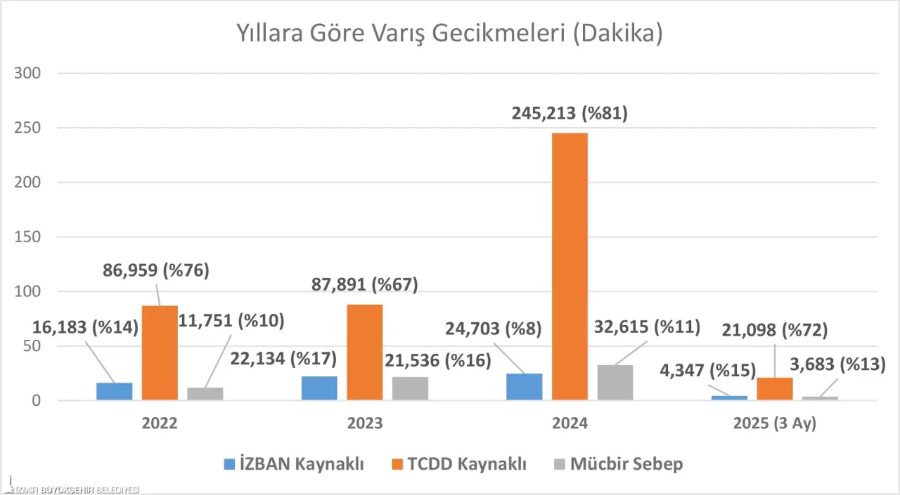 “Devlet Demir Yolları (TCDD) rayların bakımı, sinyalizasyon ile ilgili sorumlulukları yerine getirmiyor. Raylar farklı trenlerin seferleri için de kullanıldığından dolayı aksamalar yaşanıyor. Bu nedenle İZBAN seferleri düzelmiyor. Bütün konu TCDD'nin bu sisteme katkısındaki eksikliklerle ilgili. Gecikmelerin nedenlerine baktığımızda 2024'te yüzde 81'inden TCDD sorumlu. Yüzde 8'i İZBAN kaynaklı. Bu yılın ilk üç ayında yüzde 72 TCDD, yüzde 15 İZBAN ve yüzde 13 diğer nedenlerden kaynaklı. Daha önceki dönemlerde bu oranlar daha düşük. 2024'te özellikle işletme sıkıntısı var. 2023'ten 2024'e geçerken TCDD'nin rayları kullanmak için İZBAN'dan aldığı ücret yüzde 300 arttı. Türkiye'de hiçbir şey bu kadar artmıyor. Yapılan ana sözleşmeye uygun davranılmamış. Bundan sonraki dönemde halka en iyi hizmeti vermek için biz üzerimize düşeni yapmaya hazırız. Burada büyük oranda çalışması gereken TCDD'dir. Bu iki başlılık bitmeli. Ya tamemen belediyeye ya da tamamen TCDD'ye geçmeli. Önemli olan en doğru kararın verilmesi.”
