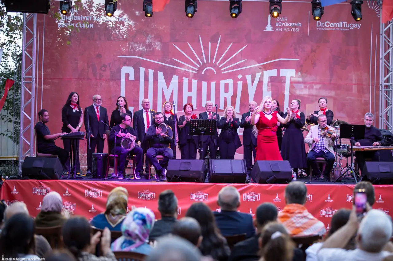 Bando gösterisinin ardından halk oyunu gösterisiyle devam eden programda; İzmir Büyükşehir Belediyesi Pop Orkestrası, Kültür Orkestrası ve Türk Halk Müziği Muhtarlar Korosu’nun konserleri bayram coşkusu yaşattı. İzmir Büyükşehir Belediye Başkanı Dr. Cemil Tugay ve yurttaşlar, koroyla birlikte İzmir Marşı’nı söyledi.