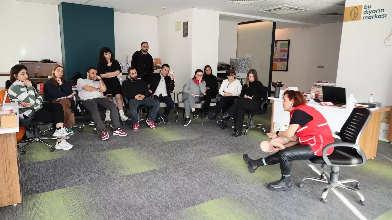 “Eller hayat kurtarır" sloganıyla verilen eğitimde, ilk yardımın önemi ve kriz anında panik yönetimini anlatan eğitimciler, uygulamalı olarak Heimlich manevrasını firma çalışanlarına gösteriyor.