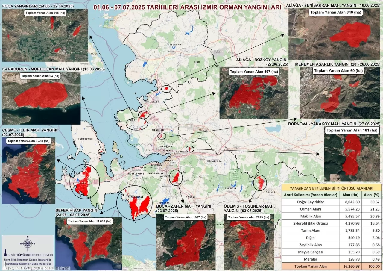 İzmir Büyükşehir Belediyesi Kent Bilgi Sistemleri Dairesi Başkanlığı, yangın bölgelerine yönelik uydu görüntülerini değerlendirdi. 1 Haziran’dan 7 Temmuz’a kadar olan süreyi ele alan yetkililer, yürek yakan sonuçlara ulaştı. Verilere göre son bir ayda yaklaşık 26 bin 260 hektarlık alan yandı. Yangınlar, en çok doğal çayırlar ile ormanlık alanları etkiledi. 5 bin 574 hektarlık orman bölgesi zarar gördü. Yine 8 bin hektarlık doğal çayır alanı ile 5 bin 485 hektarlık makilik alanın yanı sıra 4 bin 370 hektarlık sklerofil (çalı görünümlü) bitki örtüsü yandı.