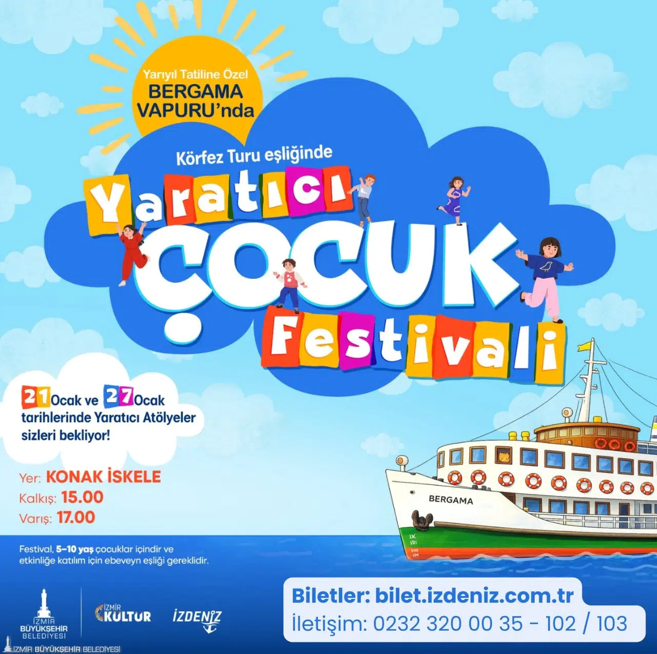 İzmir Büyükşehir Belediyesi iştiraklerinden İZDENİZ VE İzkültür, yarıyıl tatilinde çocuklar için Körfez turu eşliğinde Yaratıcı Çocuk Festivali düzenliyor. Bergama Vapuru ile 21 ve 27 Ocak’ta yapılacak turlarda 5-10 yaş arası çocuklar için eğlenceli ve eğitici atölye çalışmaları düzenlenecek.