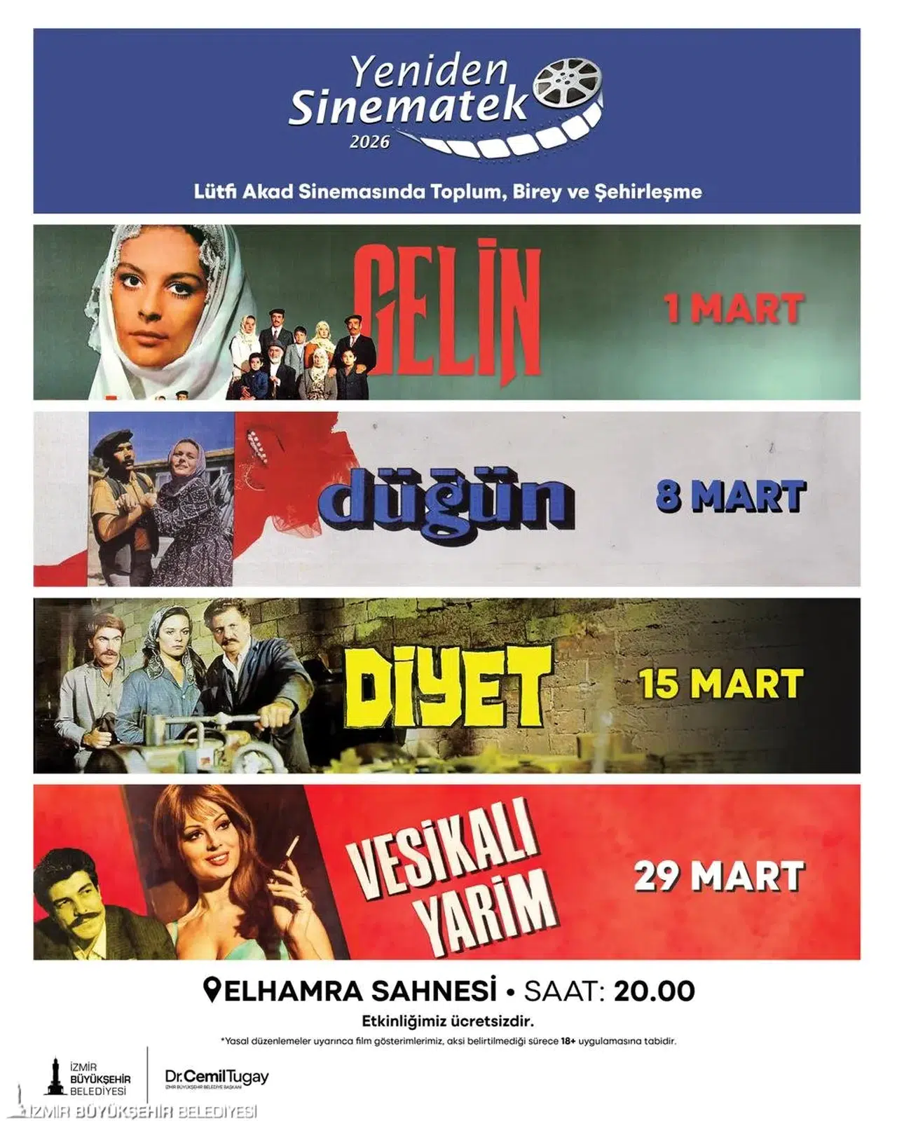 Yeniden Sinematek, mart ayında “Lütfi Ö. Akad Sinemasında Toplum, Birey ve Şehirleşme” temasıyla Elhamra Sahnesi’nde İzmirliler ile buluşmaya hazırlanıyor. Türk sinemasının usta yönetmenlerinden Lütfi Ömer Akad’ı vefatının 15. yılında anmaya vesile olacak seçkide, onun sinemasını oluşturan mihenk taşları sayılabilecek yapımlar yer alıyor. Program kapsamında usta yönetmenin “göç” üçlemesinin filmleri olan Gelin, Düğün ve Diyet’in yanı sıra Türk Sinemasının klasikleşmiş filmlerinden Vesikalı Yârim de beyaz perdeyle buluşacak. Köyden kente göçün toplum ve bireyler üzerinde yarattıklarına etkileyici bir üslupla yaklaşan yönetmen, hem dönemin toplumsal yapısı hem de aile yapısı hakkında birçok gerçekliği gözler önüne seriyor.