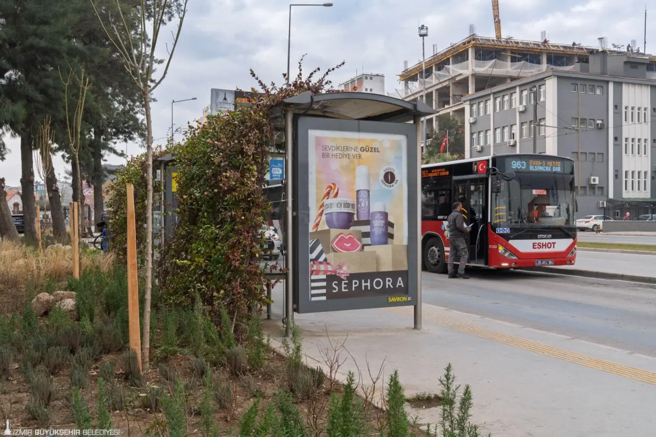 İzmir Büyükşehir Belediyesi, kamusal alanlarda yaptığı estetik dokunuşlarla kentin çehresini değiştirmeye otobüs duraklarıyla devam ediyor. Yeşil Durak projesi kapsamında durakların üstü sarmaşıklarla donatılırken, durak çevresi ise az su tüketen bitkilerle düzenleniyor.