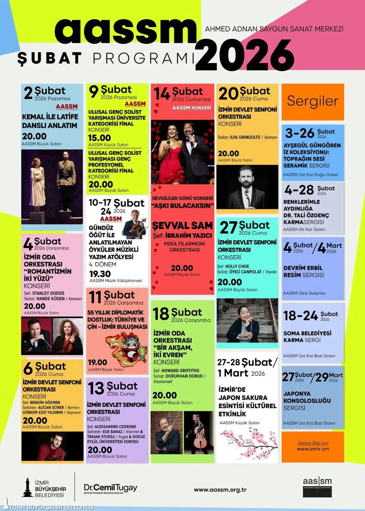 6, 13, 20, 27 Şubat tarihlerinde İzmir Devlet Senfoni Orkestrası konserleri Büyük Salon’da saat 20.00’de dinleyicilerle buluşacak. 55 Yıllık Diplomatik Dostluk: Türkiye ve Çin-İzmir Buluşması da 11 Şubat saat 19.00’da Büyük Salon’da ücretsiz olacak.