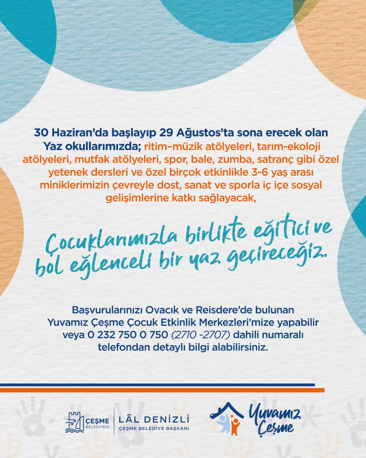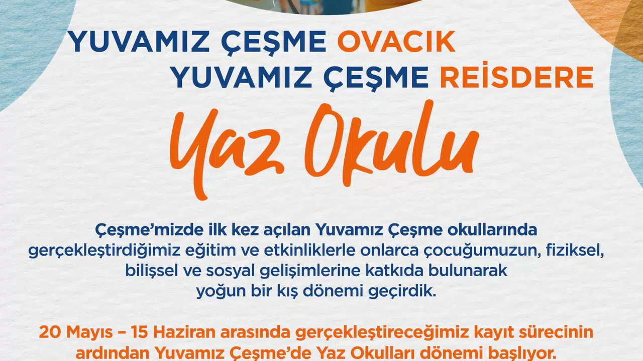 Yaz Okulu kayıtları, 20 Mayıs – 15 Haziran tarihleri arasında alınacak. Başvuru yapmak isteyen vatandaşlar, Ovacık ve Reisdere’de bulunan Yuvamız Çeşme Çocuk Etkinlik Merkezleri’ne yapabilir; detaylı bilgi için 0232 750 0 750 numaralı telefonun 2710 veya 2707 dahili hatlarını arayabilir.